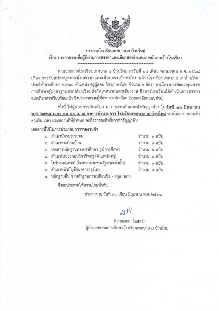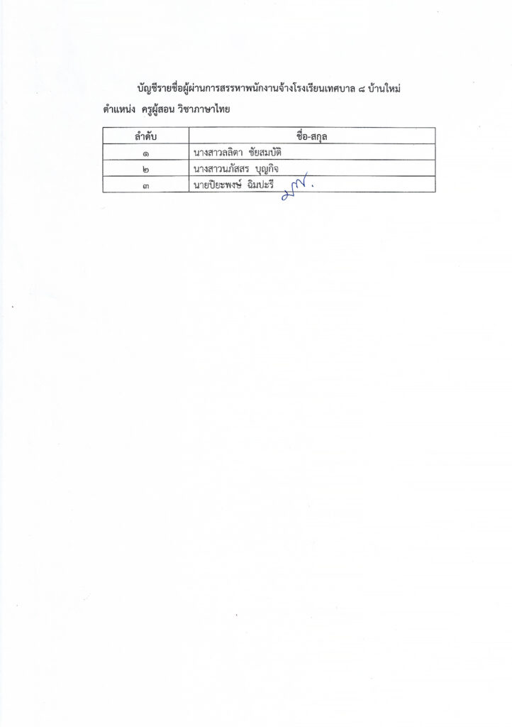 ประกาศรายชื่อผู้ที่ผ่านการสรรหาและเลือกสรร เป็นพนักงานจ้างโรงเรียน ตำแหน่ง ครูผู้สอน วิชาภาษาไทย